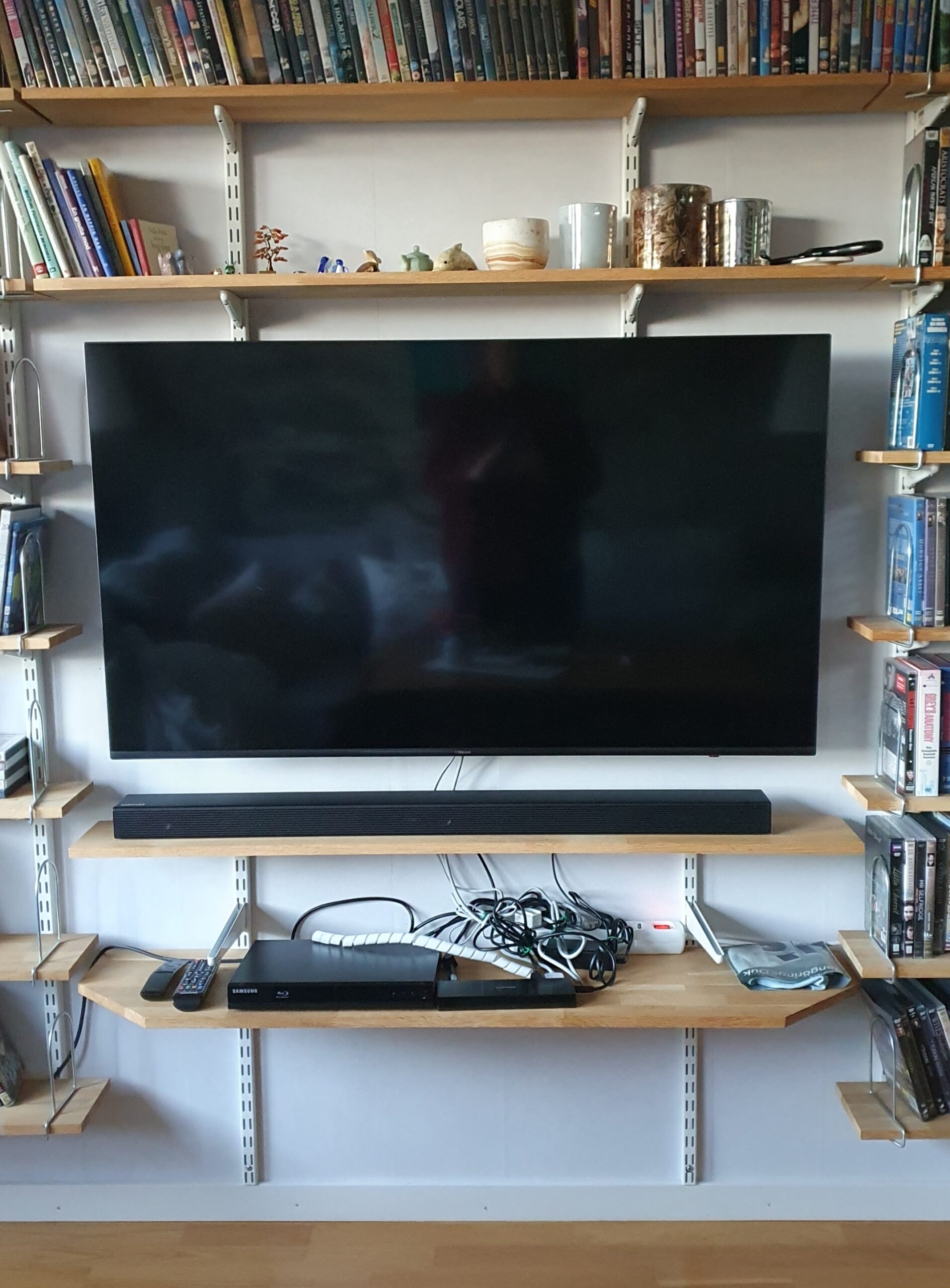 Så här ser det ut efter att jag kopplat loss allt, passat på att dammtorka, separera sladdarna och koppla in allt igen. Det såg likadant ut före inklusive damm. När de nya lampsladdarna har anslutits gäller det att få dit sladdvindan igen… Som tur är döljs röran av ett bredare hyllplan som just nu står vid sidan om. Alla tekniska påhitt och utvecklingar utan att få bort sladdar!